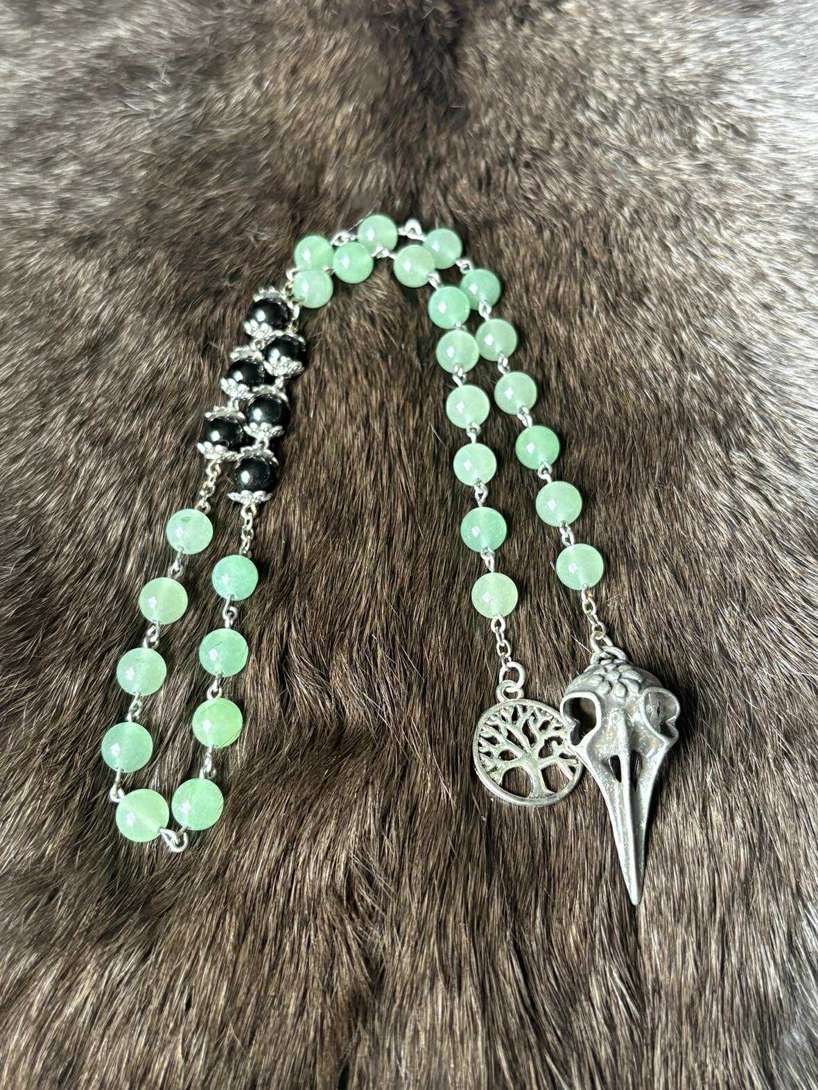 Prayer beads are made of aventurine and black tourmaline.