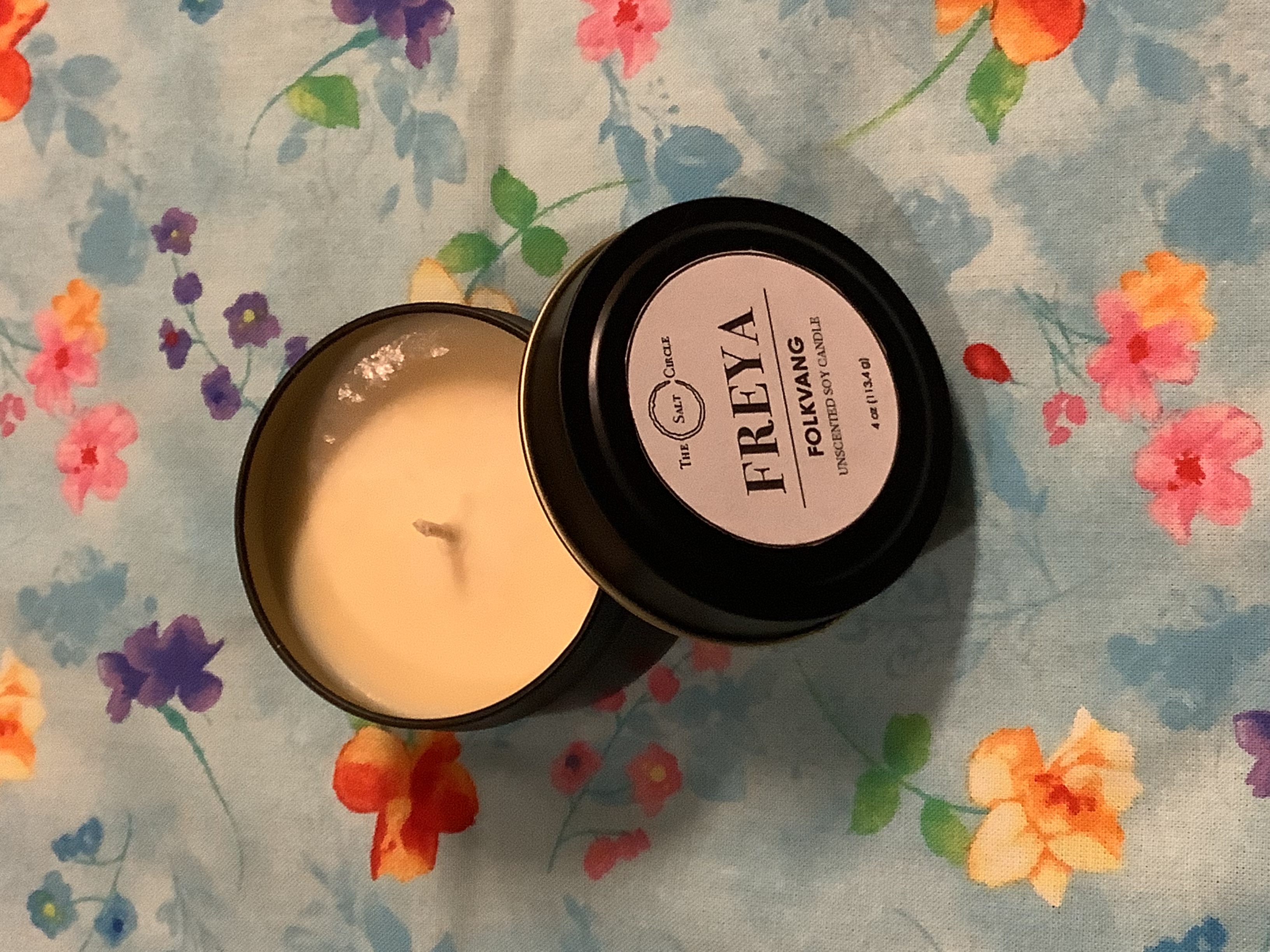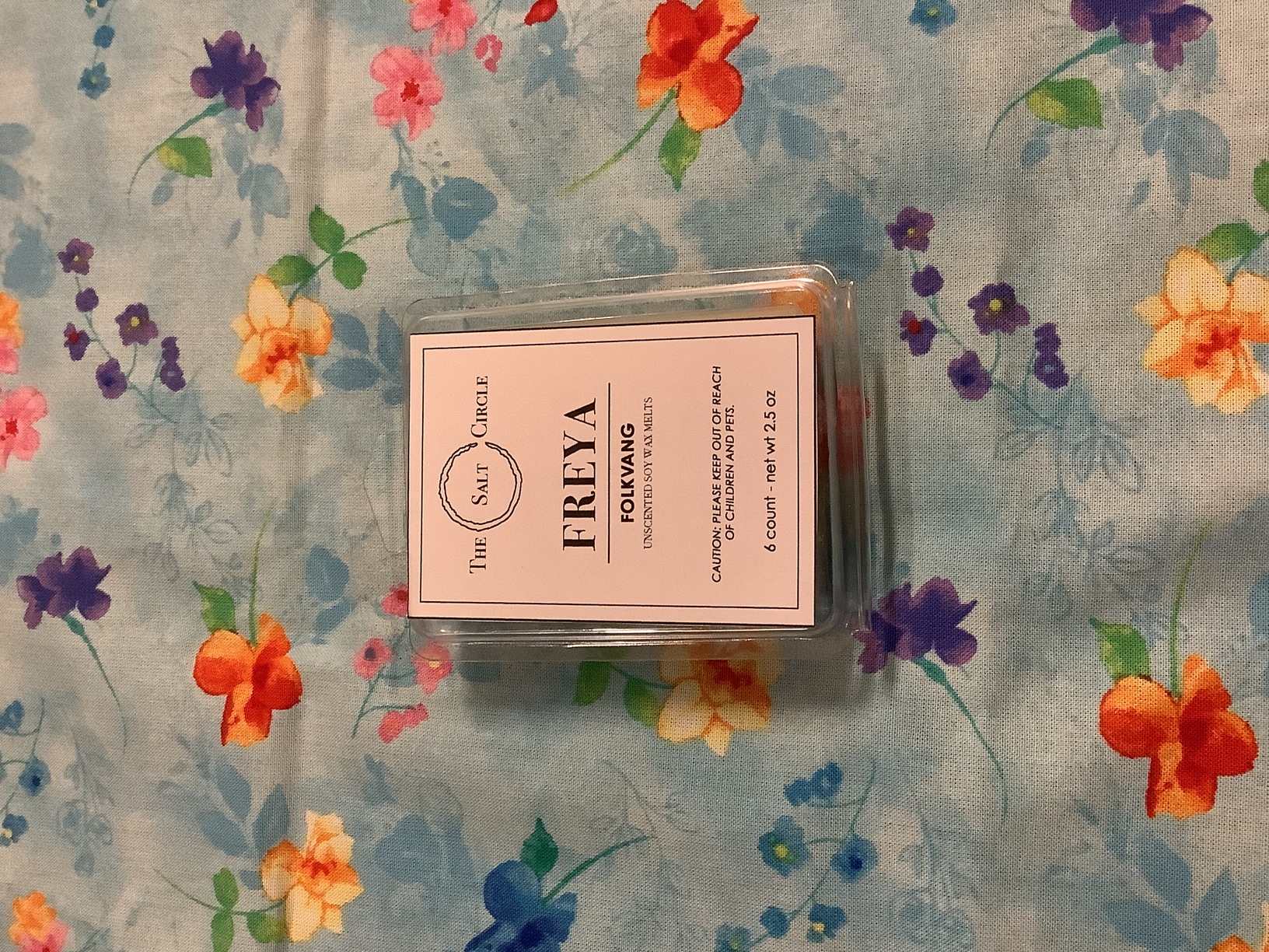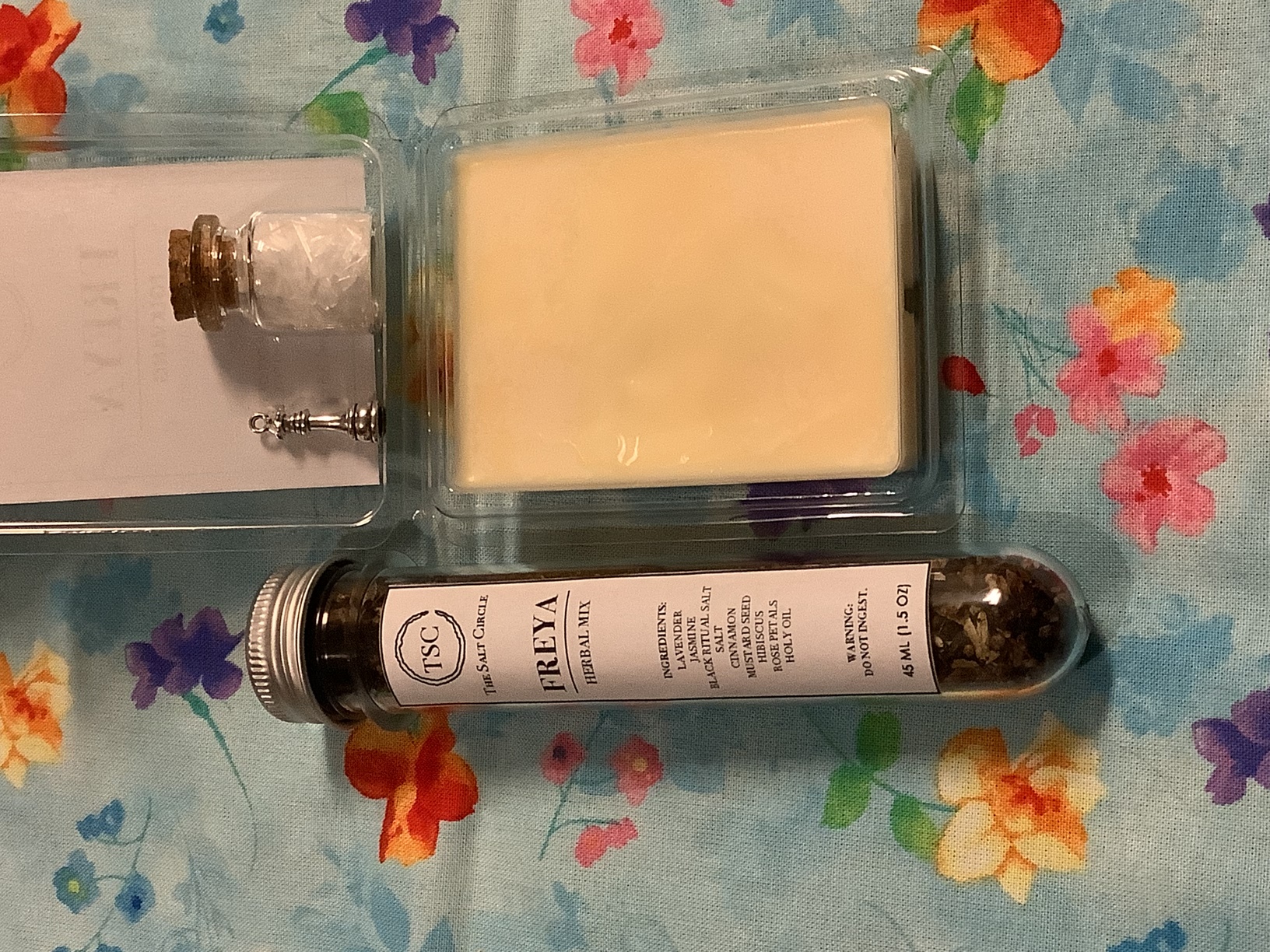 Each full kit comes with a candle, a set of melts, a vial of herbs mixed for the specified deity, a vial of stone, a charm, and a piece of cloth that can be used for your altar, as a headscarf, or however you see fit.