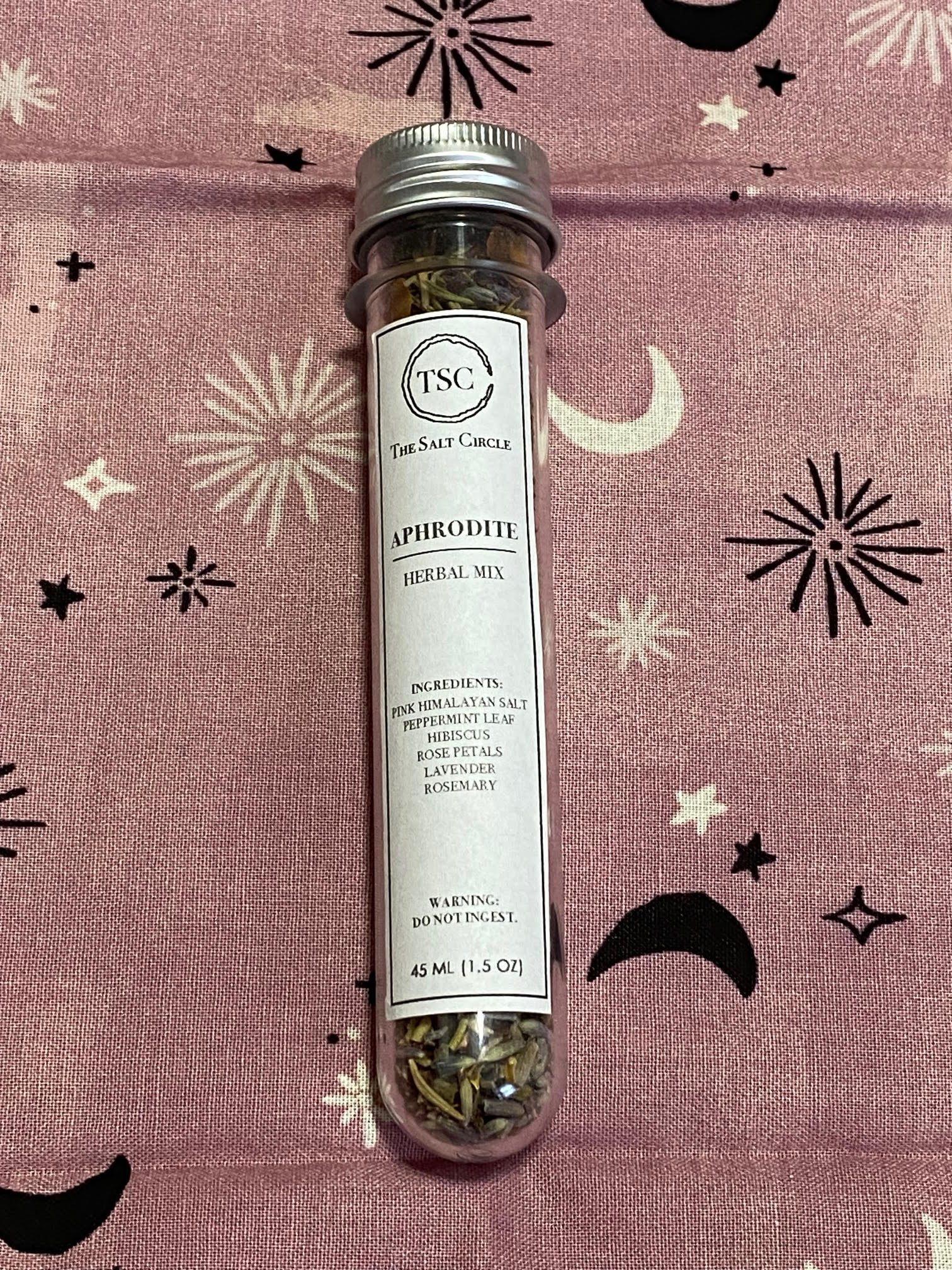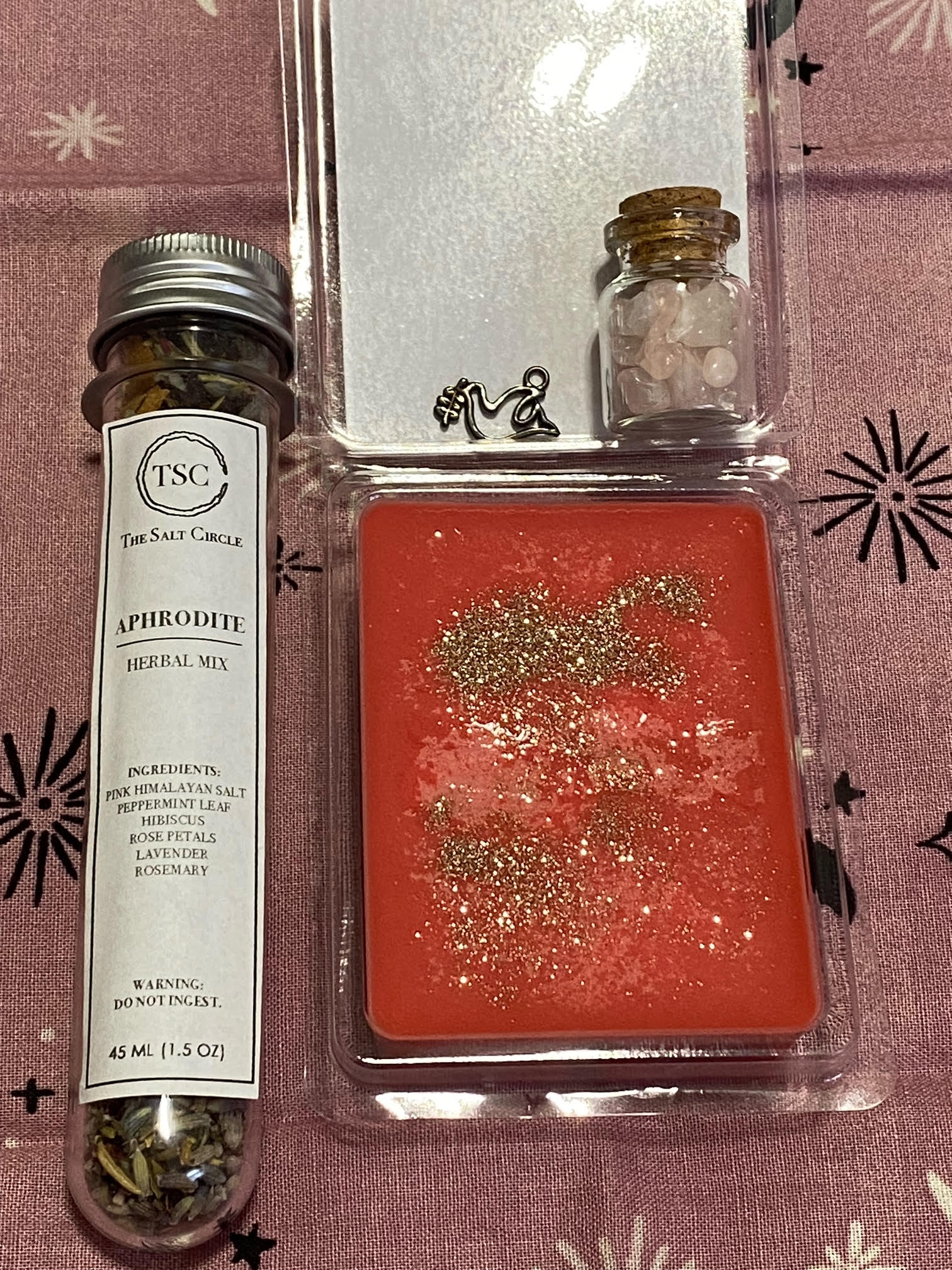 Each full kit comes with a candle, a set of melts, a vial of herbs mixed for the specified deity, a vial of stone, a charm, and a piece of cloth that can be used for your altar, as a headscarf, or however you see fit.