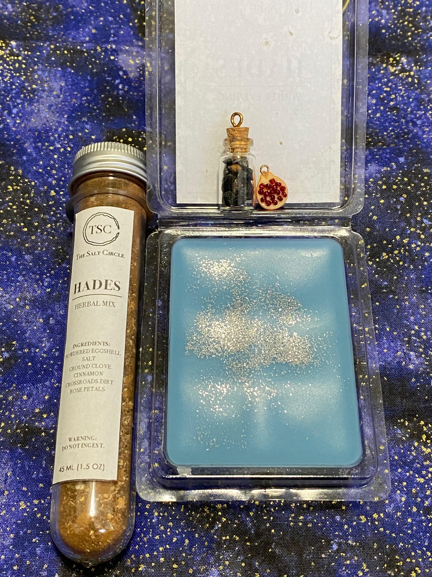 Each full kit comes with a candle, a set of melts, a vial of herbs mixed for the specified deity, a vial of stone, a charm, and a piece of cloth that can be used for your altar, as a headscarf, or however you see fit.